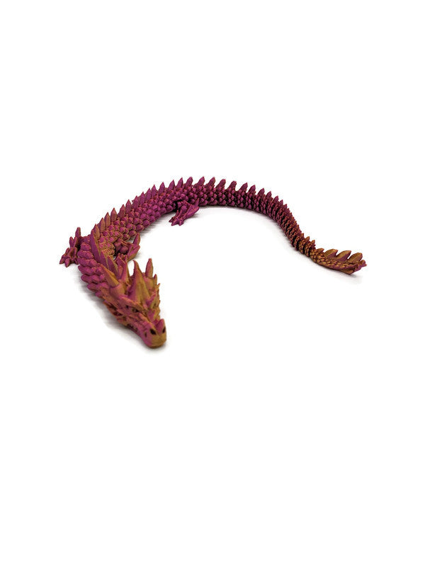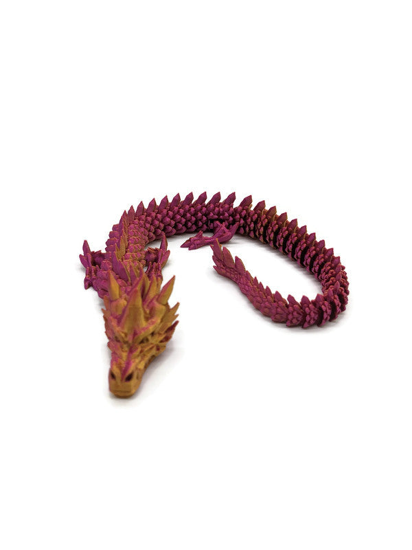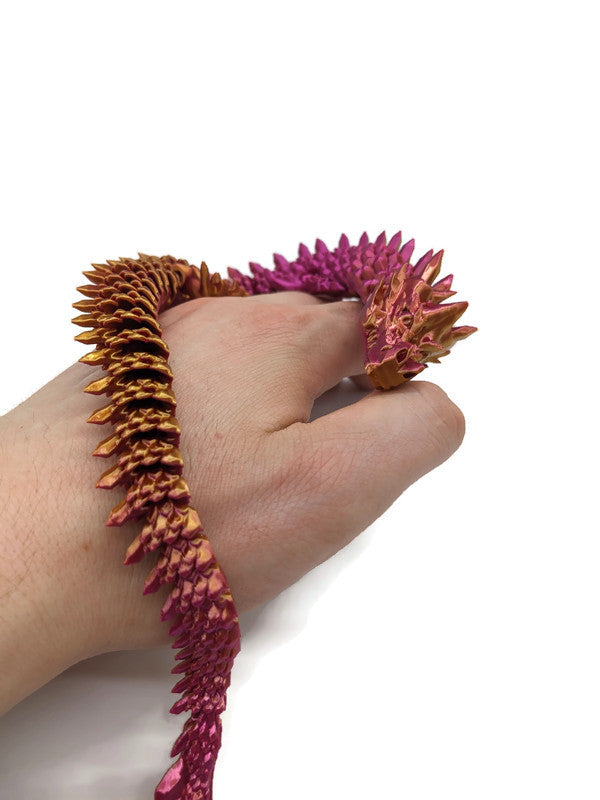 Ein majestätischer, schimmernder Drache in edlen Farbverläufen von zartem Pink bis glänzendem Gold. Je nach Lichteinfall entfaltet sich sein Farbspiel wie ein Sonnenaufgang über einem stillen See. Elegant, beweglich, faszinierend – ein echtes Schmuckstück für alle, die das Außergewöhnliche lieben.